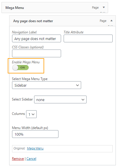 14. Select the number of columns, Mega Menu Type and sidebar in the Mega Menu widgetized area.