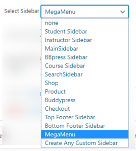 13. Select a sidebar/widget area that will be shown in the mega menu. You can create unlimited mega menus and unlimited sidebars/widgetized areas can be created using Options Panel -> Sidebar Manager.